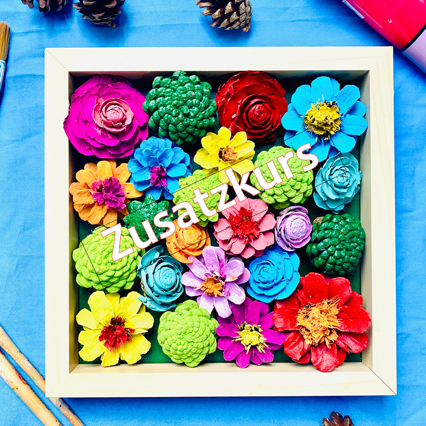 Aprilwetter? Das macht uns nichts aus! Denn aus vielen kleinen Zapfen entstehen mit Farbe wunderschöne bunte Frühlings-Blumen, die das Wetter alt aussehen lassen. Diese arrangieren wir anschließend in einem Holzrahmen zu einem tollen Frühlingsgruß.