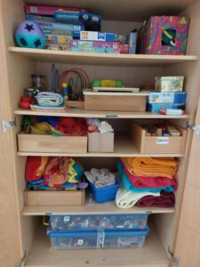 - Baby-/Kleinkind-Spielzeug und Bücher im Regal
